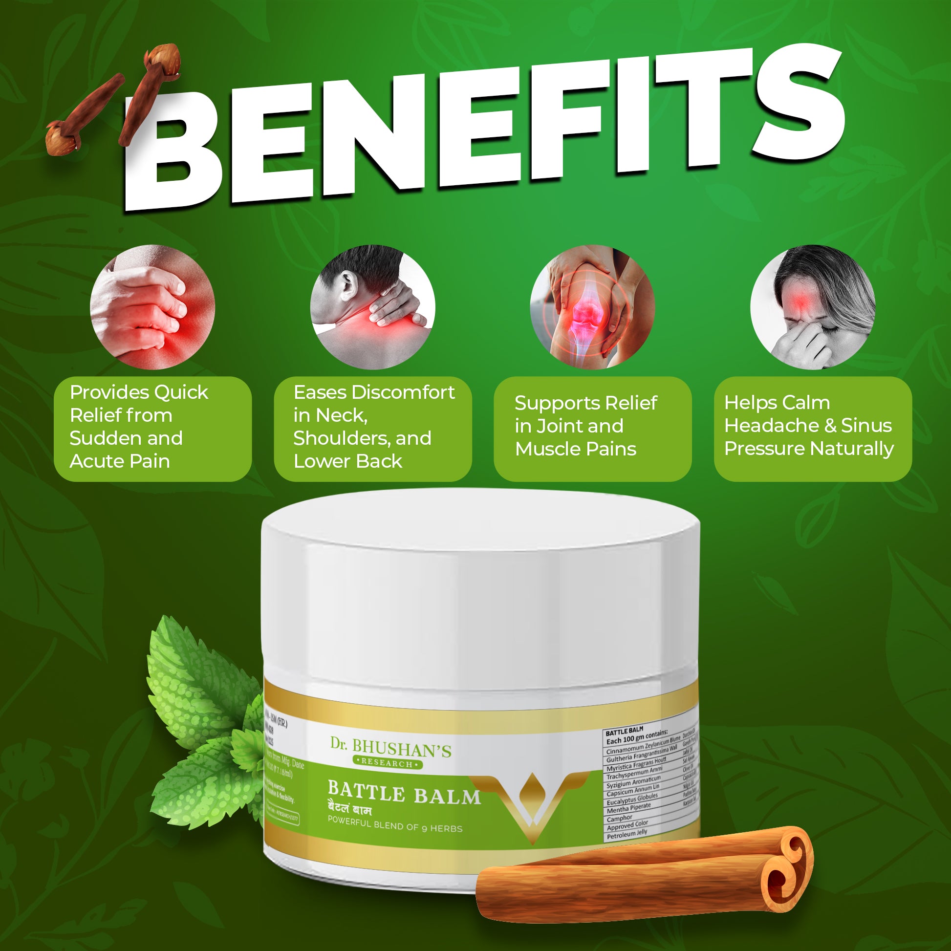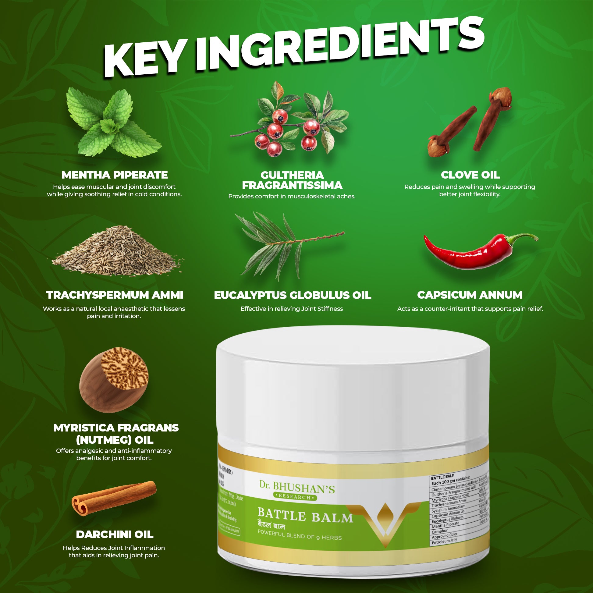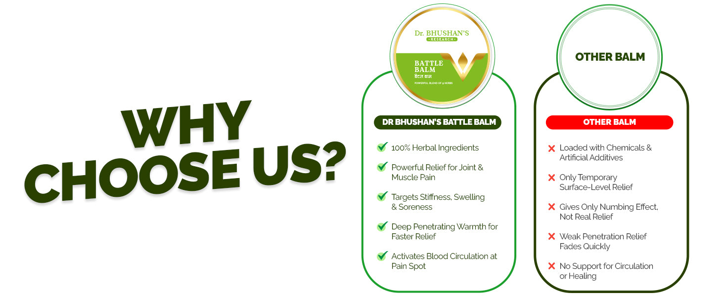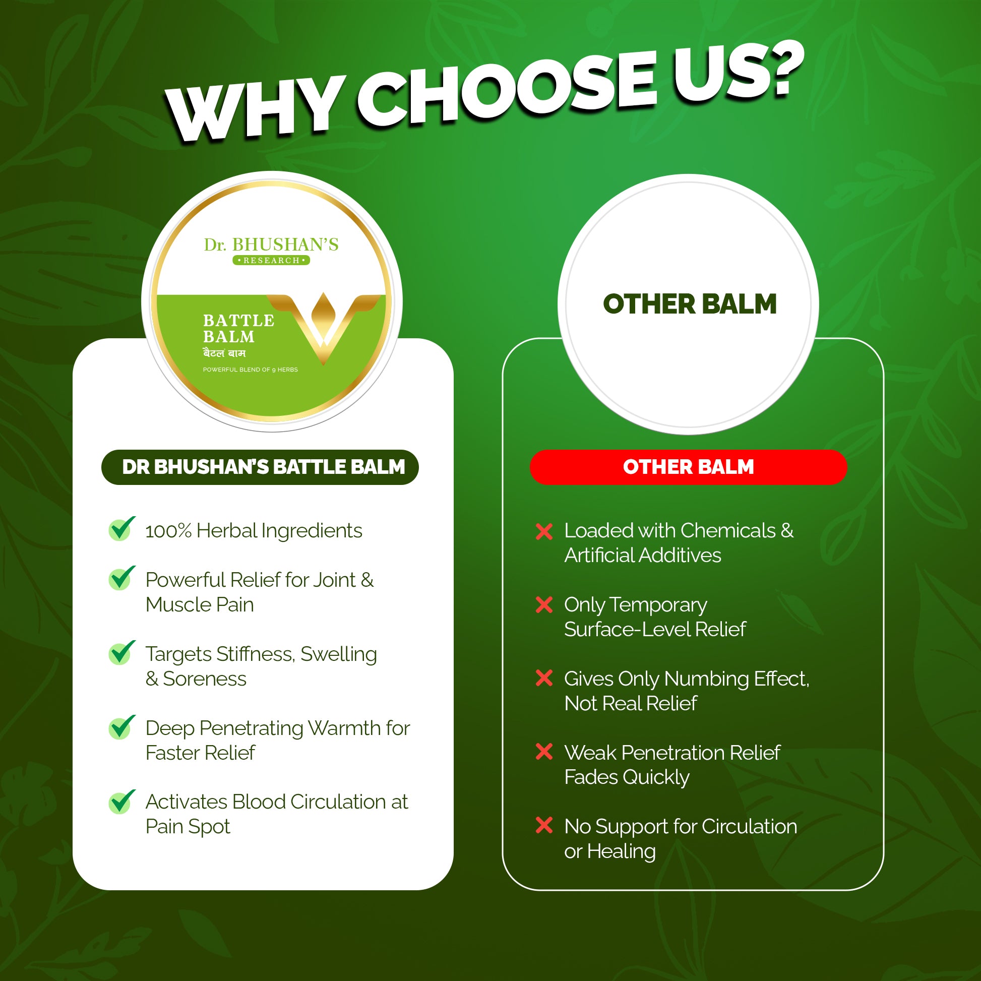 Unlike chemical balms that only give a numbing effect, Battle Balm penetrates deeply, improves blood circulation, and targets stiffness, swelling, and soreness for long-lasting relief.