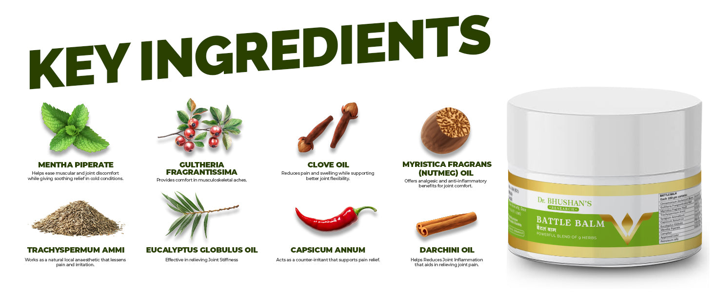 It contains Mentha Piperate, Clove Oil, Nutmeg Oil, Gultheria Oil, Trachyspermum Ammi, Eucalyptus Oil, Capsicum Annum, Darchini Oil, and more - all-natural ingredients known for pain relief and anti-inflammatory properties.