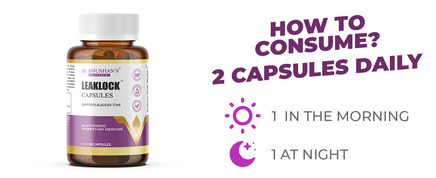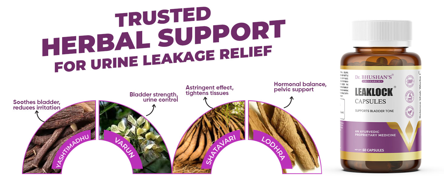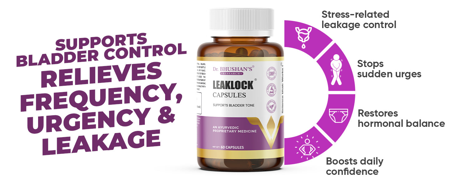 LeakLock Capsules combine herbs like Yashtimadhu, Varun, Shatavari, and Lodhra that soothe irritation, tighten tissues, balance hormones, and improve bladder strength.